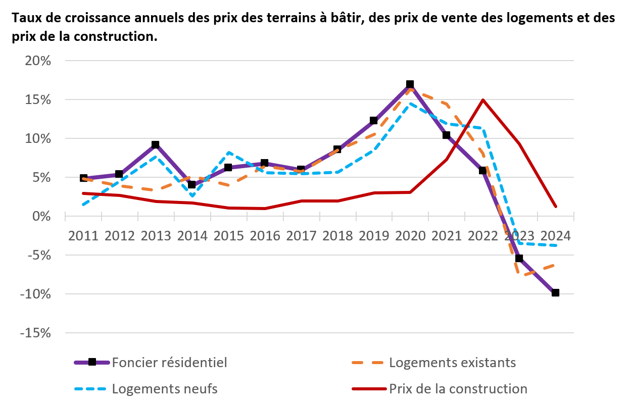 En conclusion, l’étude montre que la baisse des prix des terrains à bâtir, amorcée en 2022, a été rapide, étendue à tout le territoire, et étroitement liée à la correction du marché immobilier. Cette dynamique s’est traduite d’abord par un effondrement de l’activité en 2023, suivi d’une correction des prix qui a favorisé une reprise partielle des transactions en 2024. Les fondamentaux territoriaux du marché foncier, en revanche, ont peu changé, avec une géographie des prix stable et centrée autour de la capitale.