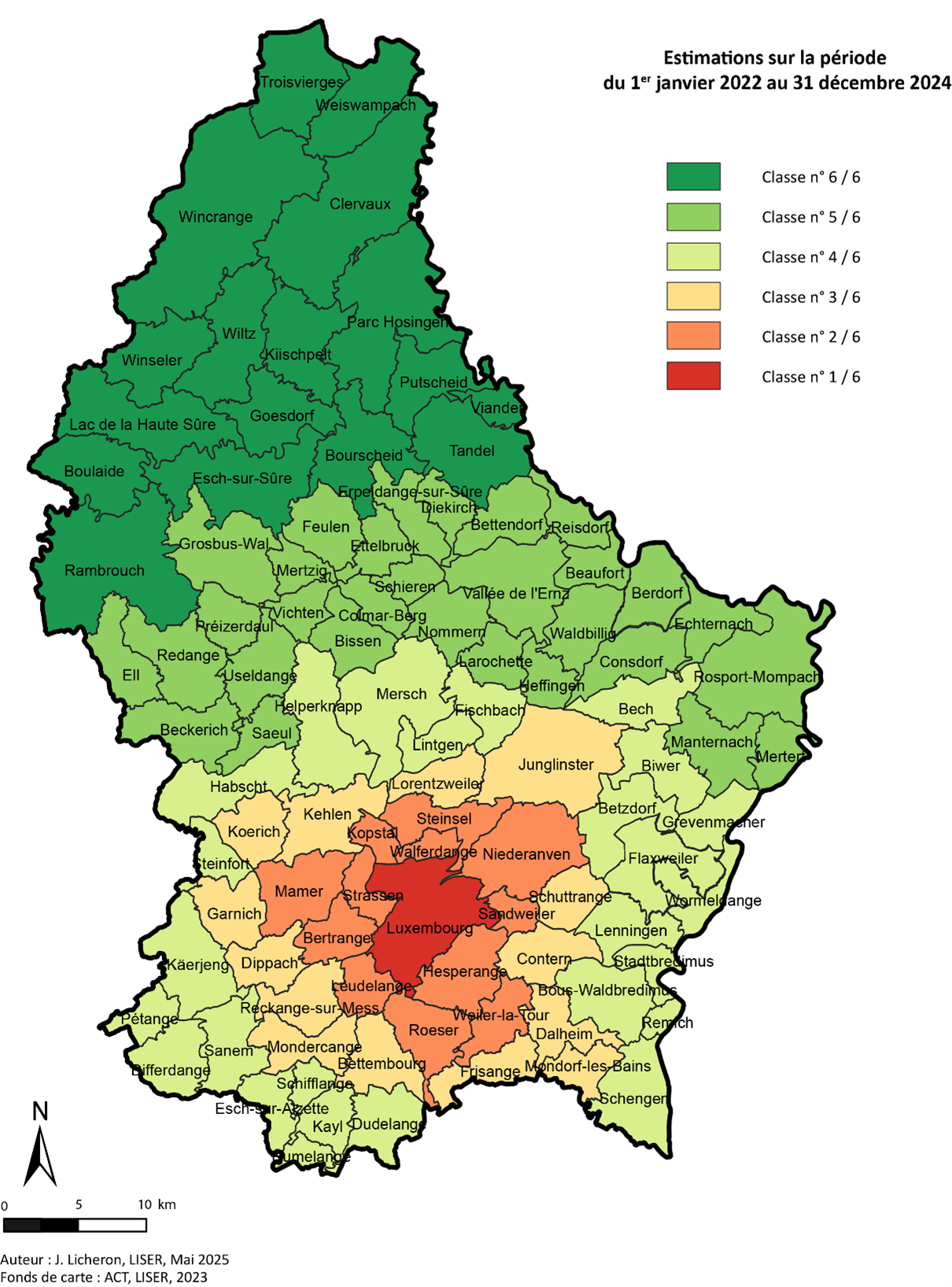 L’étude approfondit également la dimension géographique des prix fonciers à travers une segmentation des communes selon les niveaux de prix ajustés, calculés à partir d’un modèle hédonique. Cette analyse aboutit à un découpage en six zones, selon une logique de cercles concentriques autour de Luxembourg-Ville, où les prix sont les plus élevés, comme l’indique la carte ci-dessous. Ce découpage s’avère remarquablement stable par rapport à la période précédente (2020-2022), ce qui témoigne d’une hiérarchie bien ancrée des valeurs foncières à l’échelle nationale. La commune de Luxembourg, en tête, affiche un prix médian de plus de 270.000 euros par are, tandis que certaines communes du nord du pays se situent en dessous de 50.000 euros.